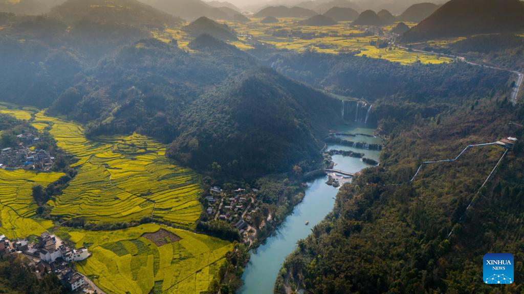 An aerial drone photo shows the scenery at Jiulong Waterfalls in Luoping County, southwest China's Yunnan Province, March 10, 2025. (Photo by Peng Yikai/Xinhua)