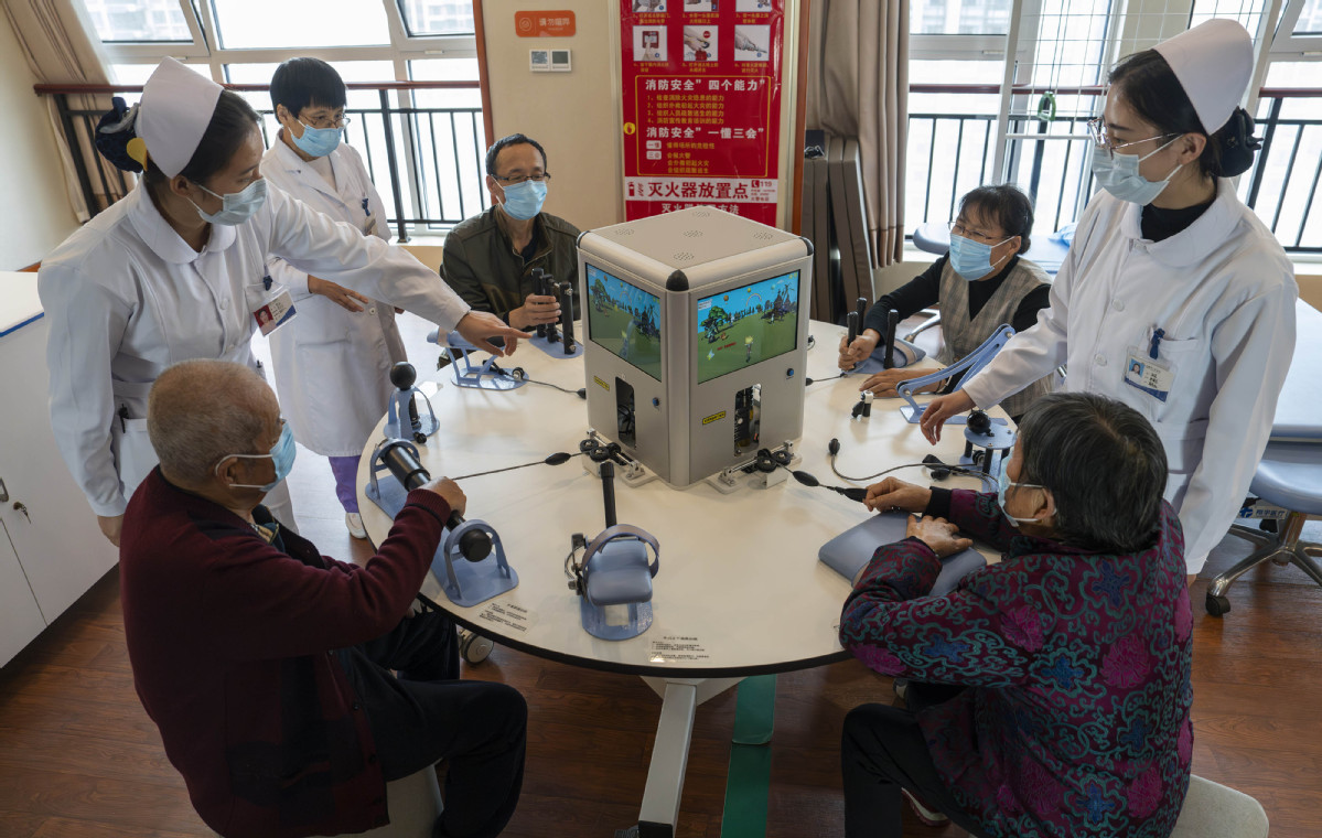 Senior citizens take rehabilitation training at an eldercare center in Rizhao, Shandong province. (Cai Yang/Xinhua)