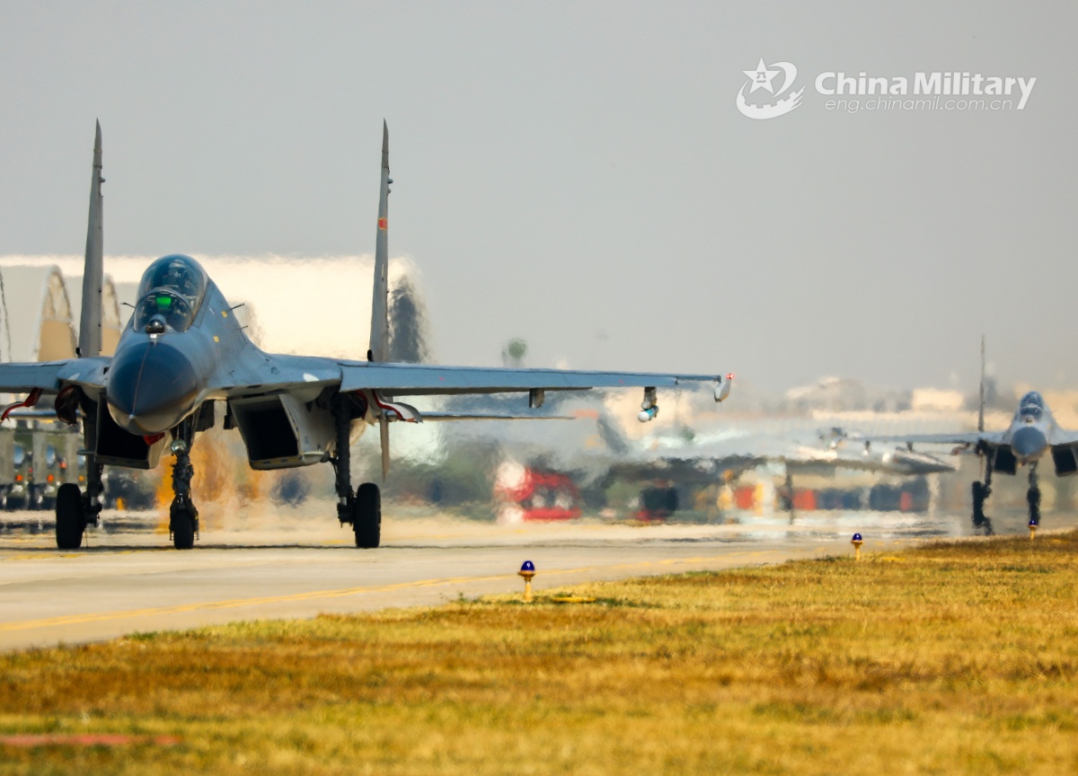 Fighter jets attached to an aviation brigade with the air force under the Chinese PLA Southern Theater Command taxi on the runway in formation before takeoff for a flight training exercise on February 20, 2025. (eng.chinamil.com.cn/Li Chengshen)