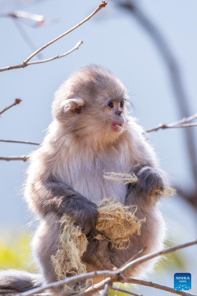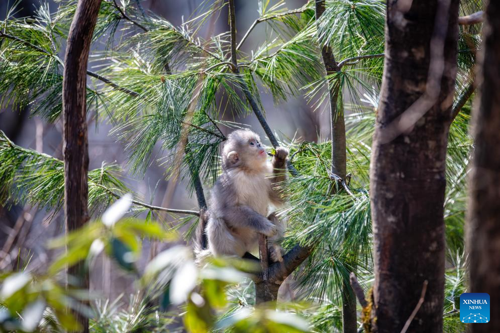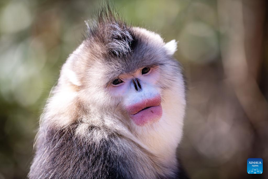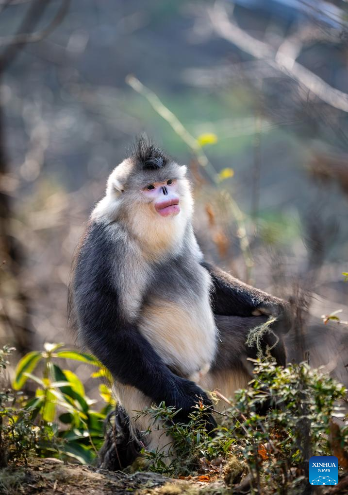 A snub-nosed monkey is pictured at the Baima Snow Mountain National Nature Reserve in southwest China's Yunnan Province, March 10, 2025.