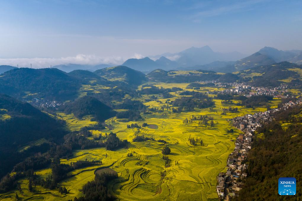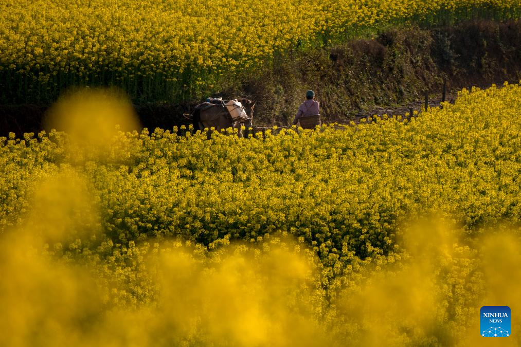This photo shows cole flower fields in Gegang Village of Luoping County, southwest China's Yunnan Province, March 11, 2025. (Photo by Peng Yikai/Xinhua)