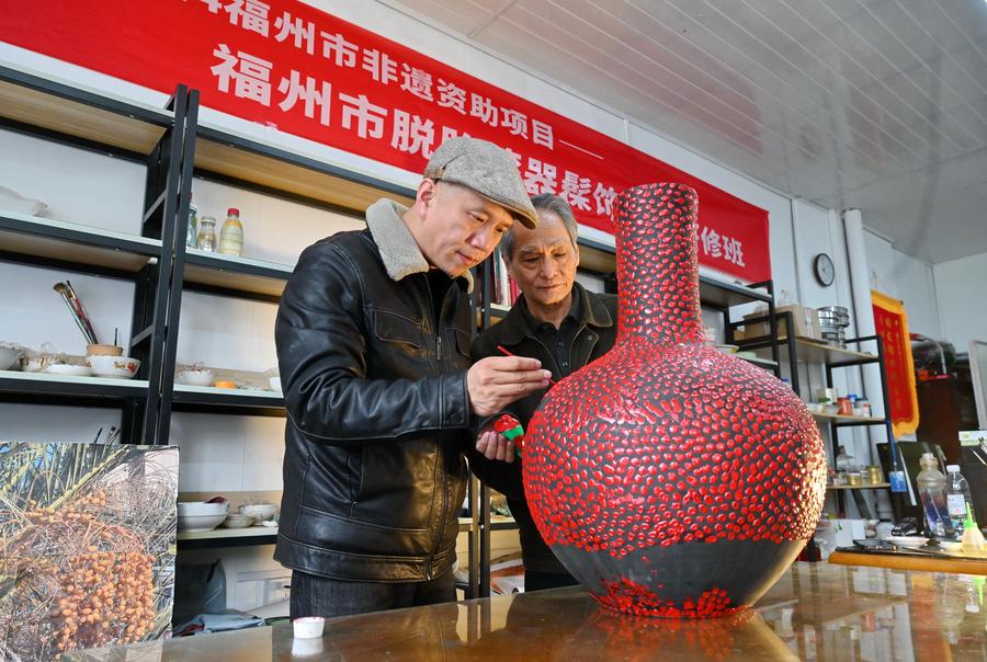 FUZHOU, March 11 (Xinhua) -- Fuzhou, southeast China's Fujian Province, is home to a rich intangible cultural heritage, including Shoushan stone carvings, Fuzhou bodiless lacquerware, wood carvings, and oil-paper umbrellas, etc.