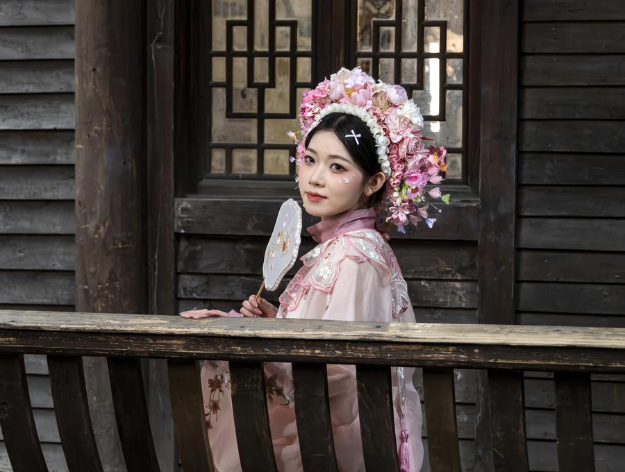 A tourist wearing flowery headwear poses for photos in Fuzhou, southeast China's Fujian Province, Feb. 3, 2025. (Xinhua/Wei Peiquan)