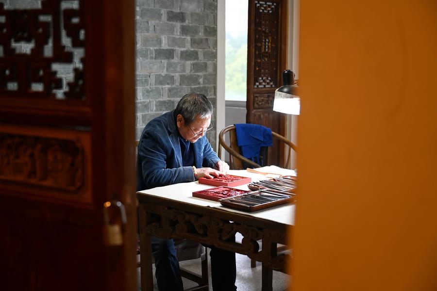 Craft artist Yuan Shiyong works on a piece of lacquerware at his studio in Fuzhou, southeast China's Fujian Province, March 4, 2025. (Xinhua/Lin Shanchuan)