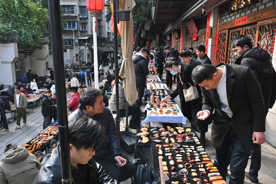 People purchase Shoushan stone carving products at a market in Fuzhou, southeast China's Fujian Province, March 8, 2025. (Xinhua/Jiang Kehong)