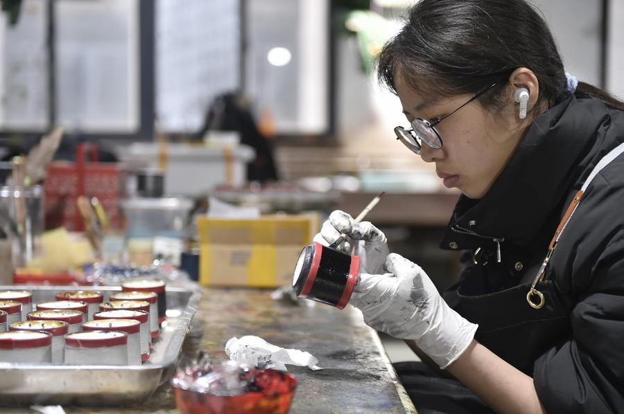 A staff member makes a piece of lacquerware at a studio in Fuzhou, southeast China's Fujian Province, March 6, 2025. (Xinhua/Lu Peng)
