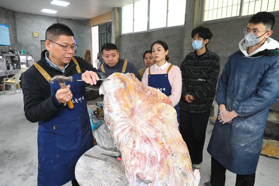 Craft artist Zheng Zeping (C) instructs students on Shoushan stone carvings at a studio in Fuzhou, southeast China's Fujian Province, March 5, 2025. (Xinhua/Lu Peng)