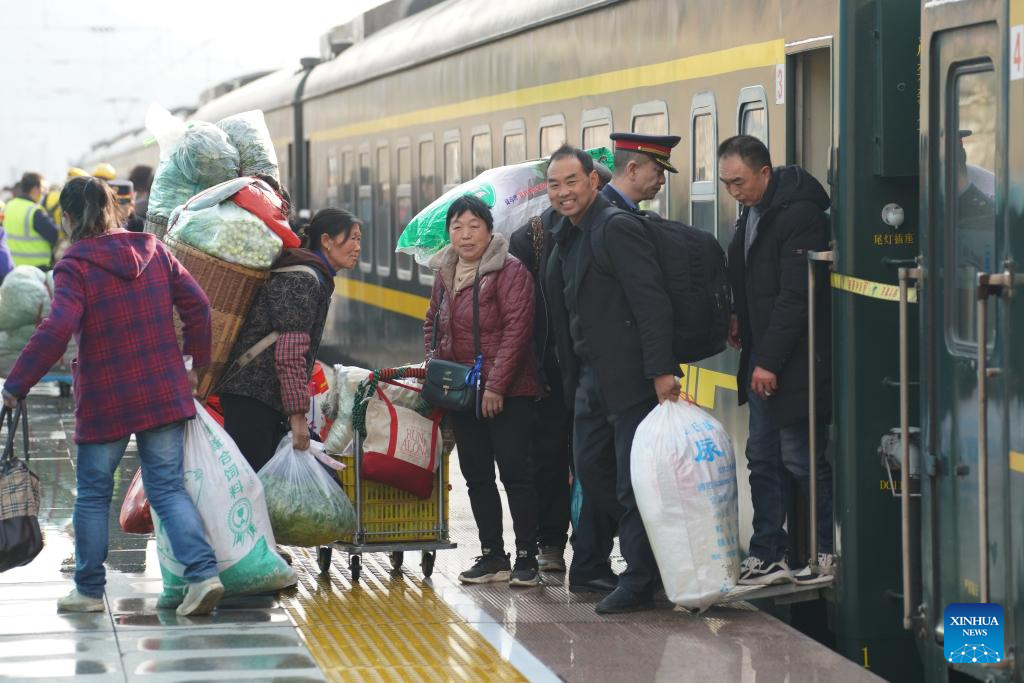 Passengers get on and off the No. 6064 train at the Yangpingguan Station in Hanzhong, northwest China's Shaanxi Province, Feb. 17, 2025. (Xinhua/Shao Rui)