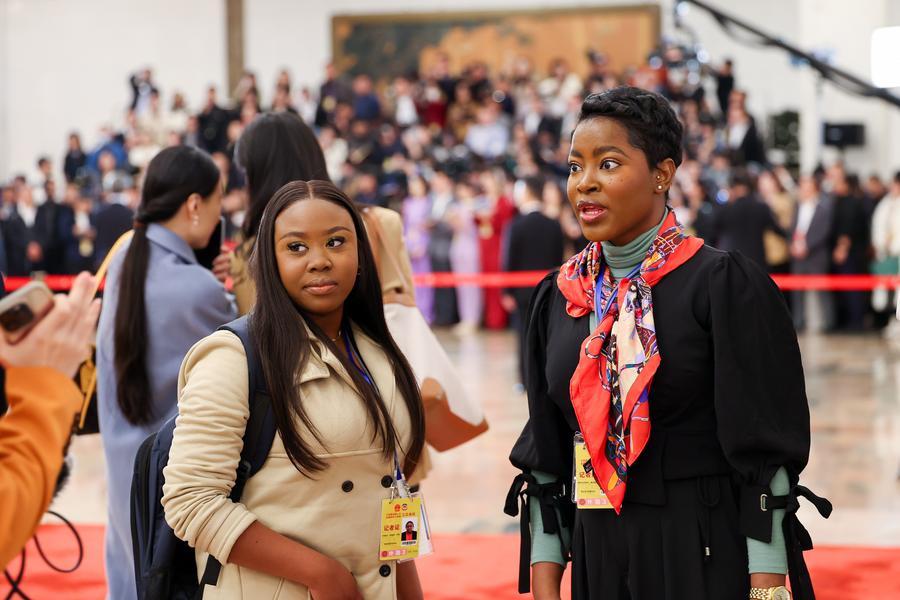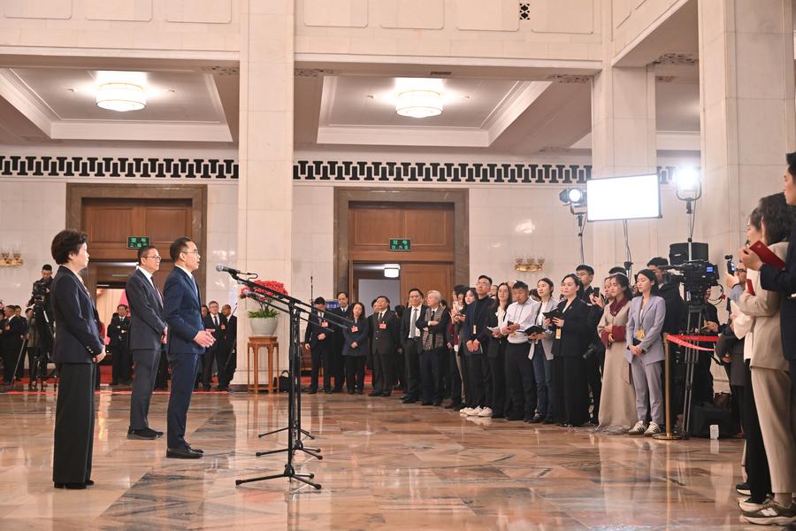 Members of the 14th National Committee of the Chinese People's Political Consultative Conference (CPPCC) attend a group interview ahead of the opening meeting of the third session of the 14th CPPCC National Committee at the Great Hall of the People in Beijing, capital of China, March 4, 2025. (Xinhua/Liu Bin)