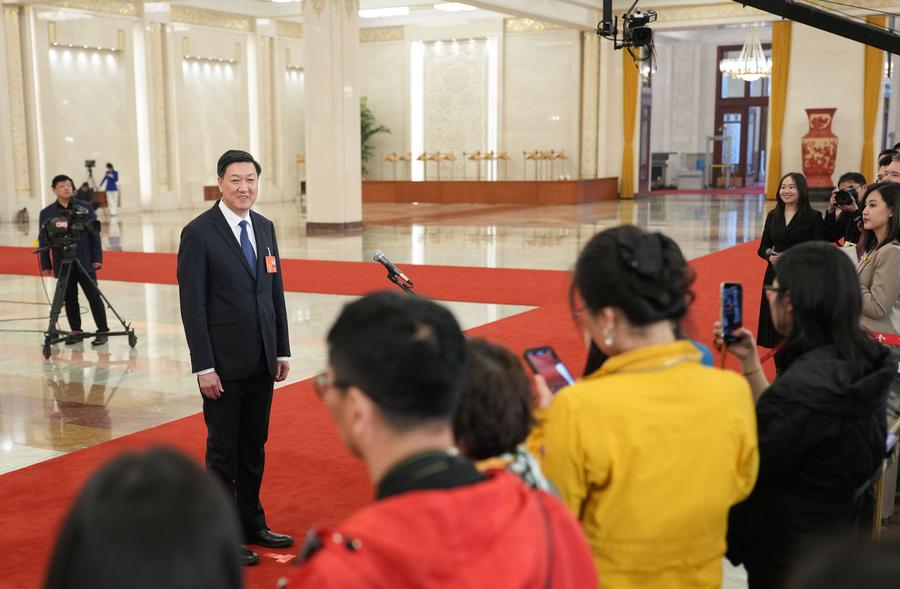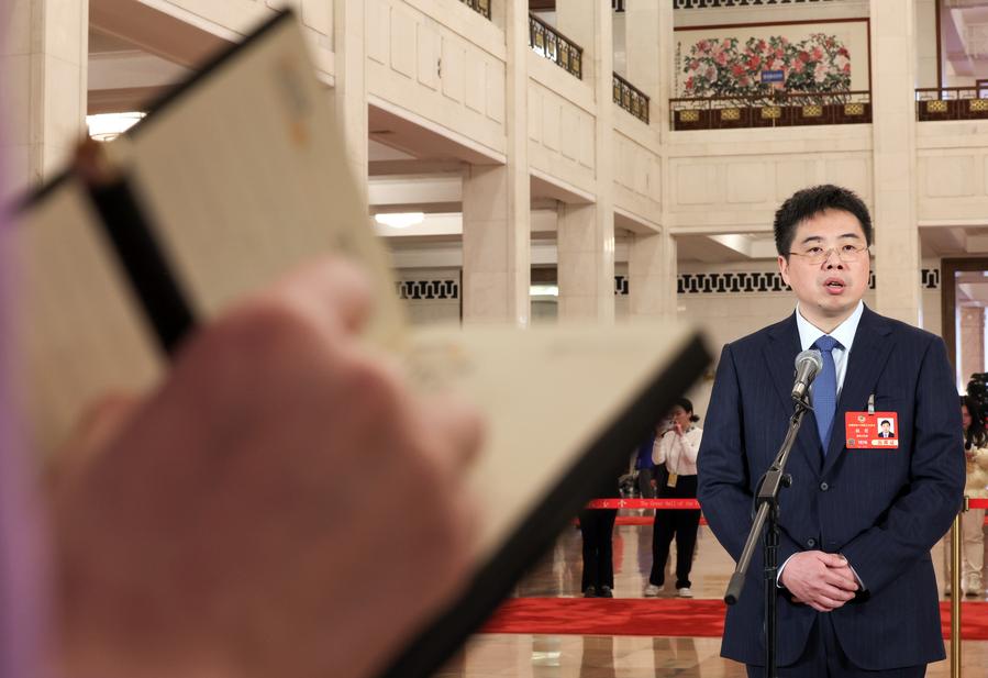 Zhao Hong, a member of the 14th National Committee of the Chinese People's Political Consultative Conference (CPPCC), attends a group interview ahead of the opening meeting of the third session of the 14th CPPCC National Committee at the Great Hall of the People in Beijing, capital of China, March 4, 2025. (Xinhua/Yin Gang)