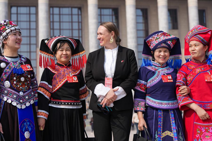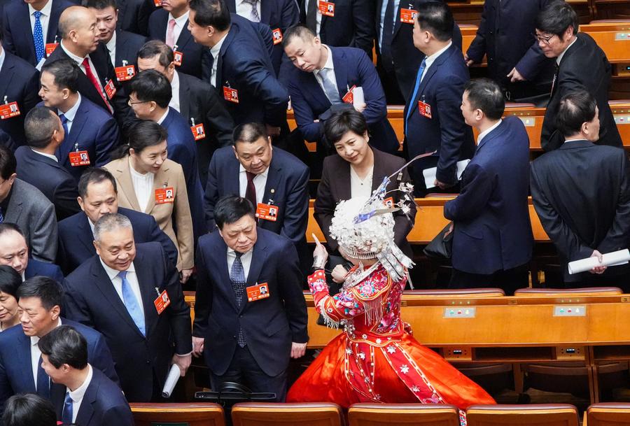 A national lawmaker wearing ethnic costumes talks to other deputies to the 14th National People's Congress (NPC) after the second plenary meeting of the third session of the 14th NPC in Beijing, capital of China, March 8, 2025. (Xinhua/Liu Dawei)