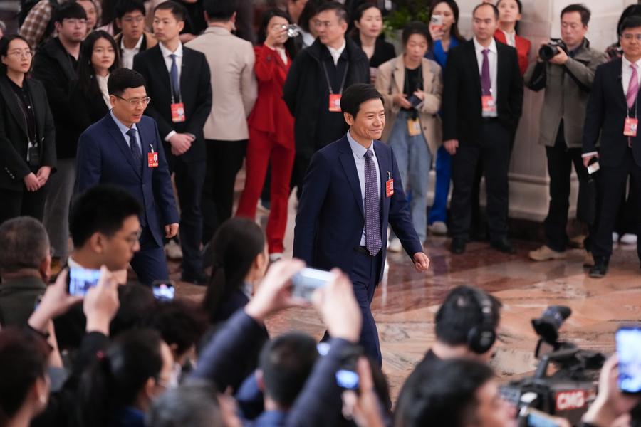 Deputies to the 14th National People's Congress (NPC) arrive for a group interview ahead of the closing meeting of the third session of the 14th NPC at the Great Hall of the People in Beijing, capital of China, March 11, 2025. (Xinhua/Xu Bingjie)