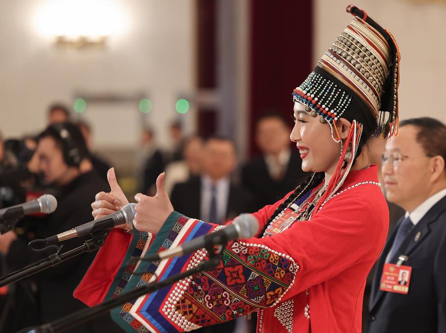 Gexi Wangmu, a deputy to the 14th National People's Congress (NPC), attends a group interview ahead of the opening meeting of the third session of the 14th NPC at the Great Hall of the People in Beijing, capital of China, March 5, 2025. (Xinhua/Xu Bingjie)