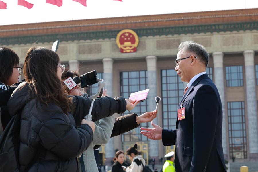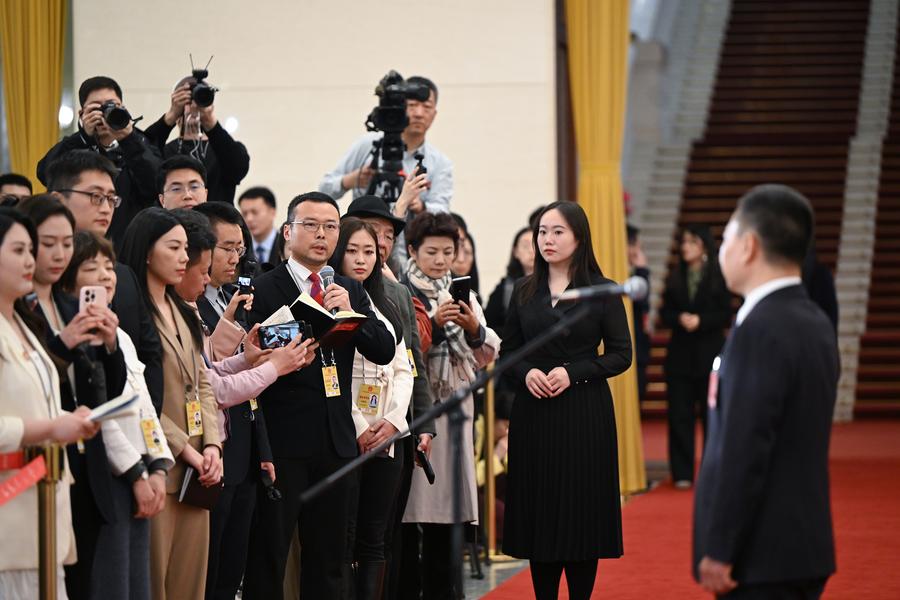 Deputies to the 14th National People's Congress (NPC) attend a group interview ahead of the second plenary meeting of the third session of the 14th NPC at the Great Hall of the People in Beijing, capital of China, March 8, 2025. (Xinhua/Lyu Shuai)