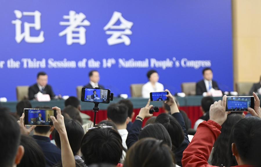 Journalists work at a press conference on people's livelihood for the third session of the 14th National People's Congress (NPC) in Beijing, capital of China, March 9, 2025. China's Minister of Civil Affairs Lu Zhiyuan, Minister of Human Resources and Social Security Wang Xiaoping, Minister of Housing and Urban-Rural Development Ni Hong, and head of the National Health Commission Lei Haichao attended the press conference. (Xinhua/Xu Bingjie)