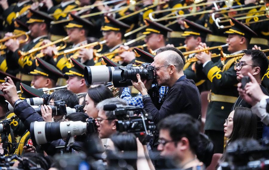 Foreign journalists work at the Great Hall of the People in Beijing, capital of China, March 4, 2025. (Xinhua/Liu Bin)