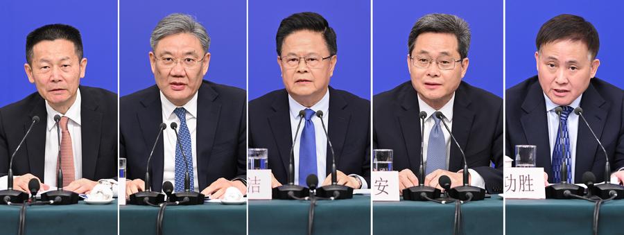 This combo photo shows Zheng Shanjie (C), head of the National Development and Reform Commission, Lan Fo'an (2nd R), minister of finance, Wang Wentao (2nd L), minister of commerce, Pan Gongsheng (1st R), governor of the People's Bank of China, and Wu Qing (1st L), chairman of the China Securities Regulatory Commission, attending a press conference on economy for the third session of the 14th National People's Congress (NPC) in Beijing, capital of China, March 6, 2025. (Xinhua/Xu Bingjie)