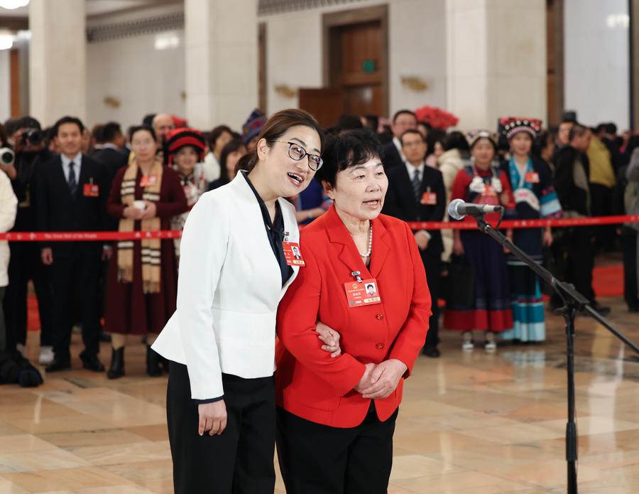 Yang Yuni, a member of the 14th National Committee of the Chinese People's Political Consultative Conference (CPPCC), attends a group interview ahead of the second plenary meeting of the third session of the 14th CPPCC National Committee at the Great Hall of the People in Beijing, capital of China, March 7, 2025. (Xinhua/Yin Gang)