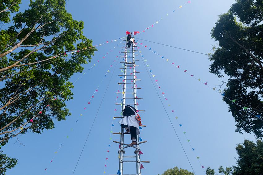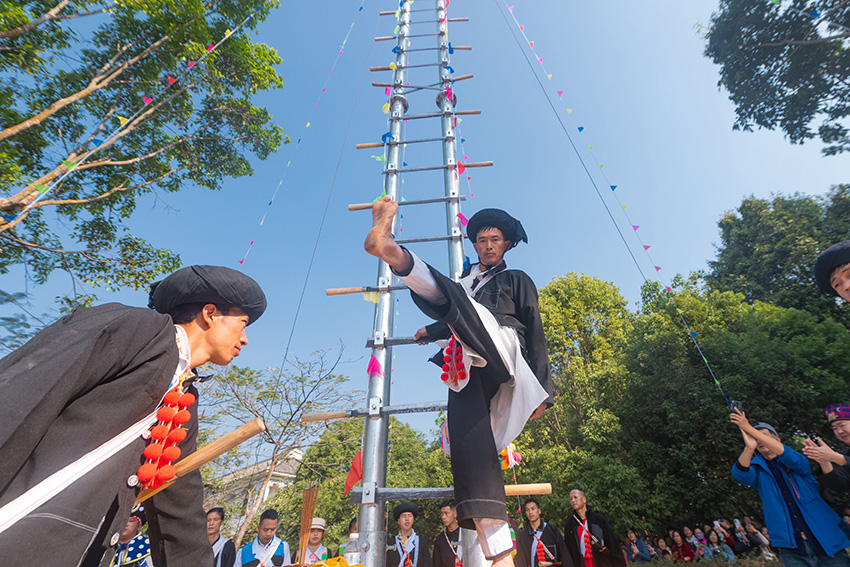 Performers climb a blade setup in a performance held to celebrate the Kuoshi Festival, or the Lisu New Year, in Dehong Dai and Jingpo Autonomous Prefecture, southwest China's Yunnan Province. (Photo by Gui Jinzai from the media convergence center of Longchuan county)