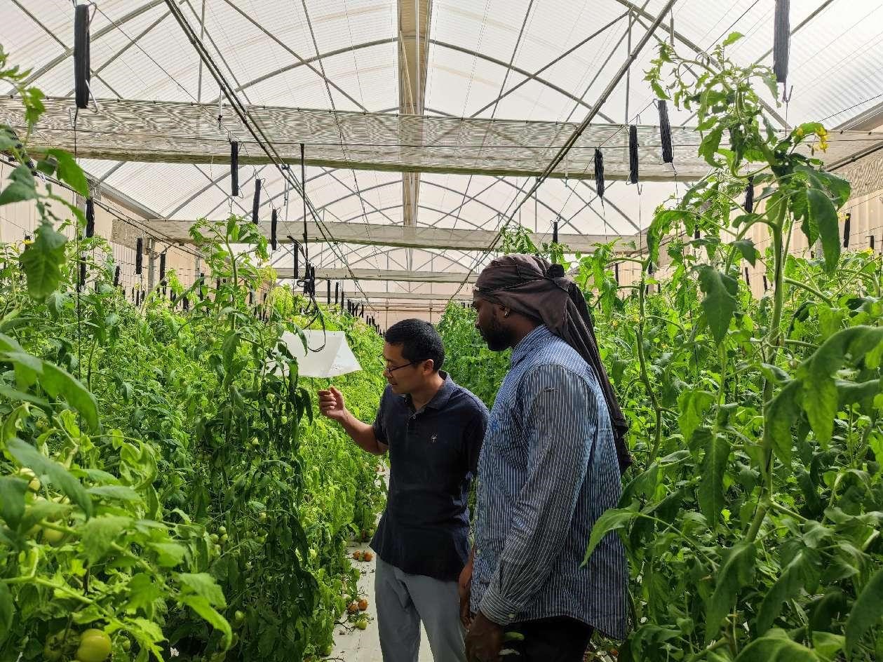 A Chinese expert (left) checks a greenhouse for plant diseases and insect pests in Cape Verde. (Photo/Ding Hongchang)