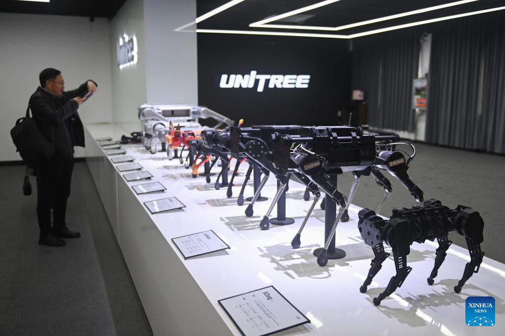 A visitor takes photos of the robotic dogs at the exhibition hall of Unitree Robotics in Hangzhou, east China's Zhejiang Province, Feb. 20, 2025. (Xinhua/Huang Zongzhi)