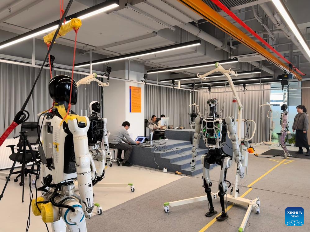 Humanoid robots are trained to swing their arms at the Zhejiang humanoid robot innovation center in Ningbo, east China's Zhejiang Province, Feb. 19, 2025. (Xinhua/Zheng Keyi)