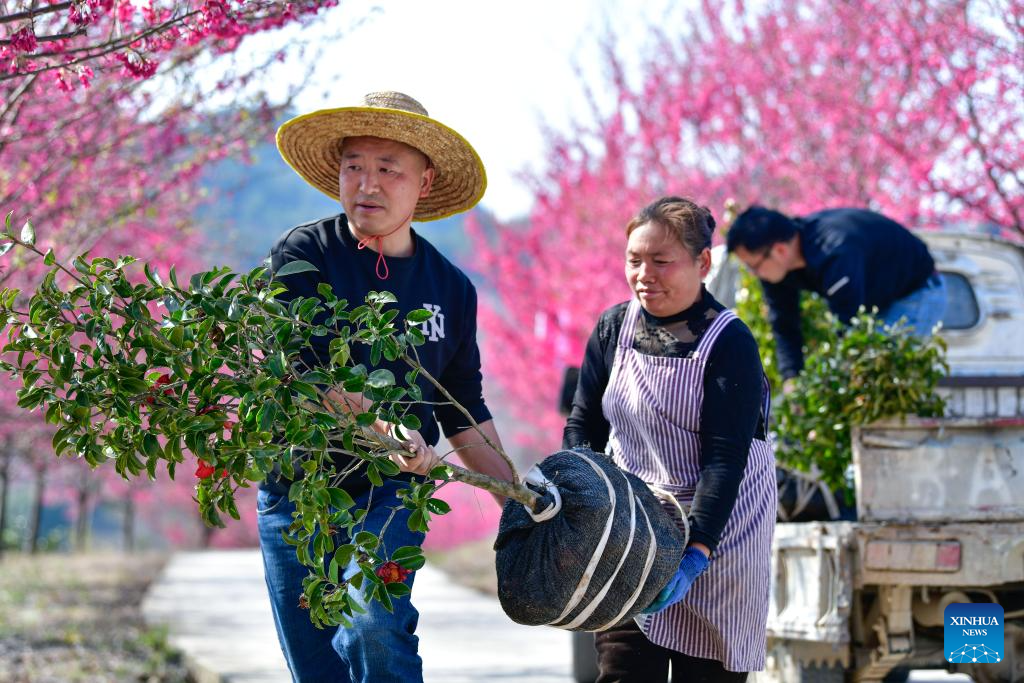 Wu Guangrong (C) and villagers cultivate camellia seedlings at the ecological park in Longli County, southwest China's Guizhou Province, March 11, 2025. Wu Guangrong, born in Fangxiang Township of Guizhou Province, has been engaged in the landscaping industry for many years since he graduated from a forestry vocational school in 2001.