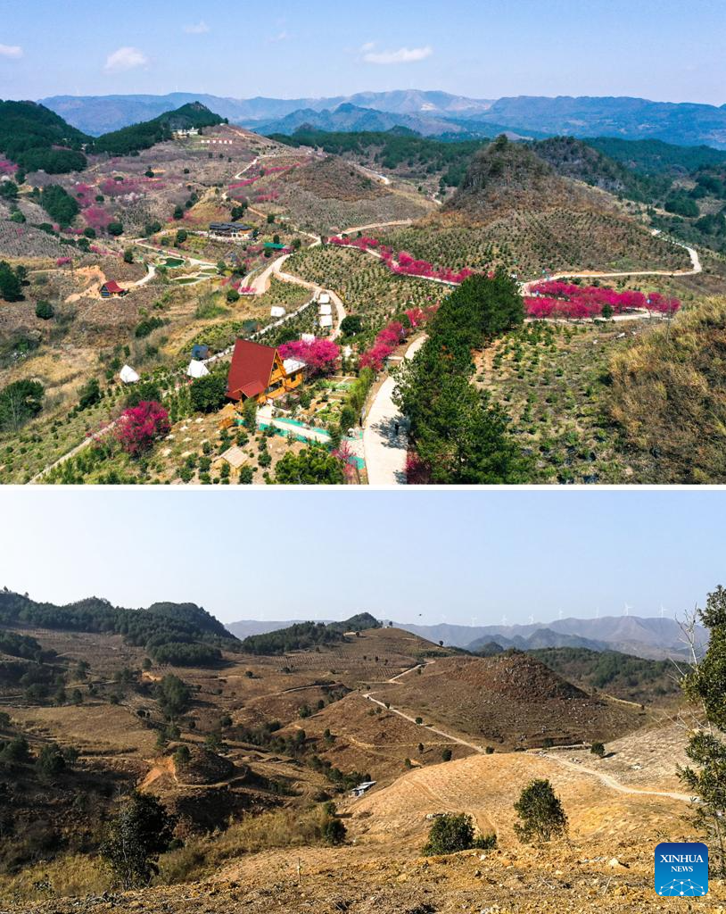 This combo photo shows aerial views of an ecological park on March 12, 2025 (above) and the barren hills before its transformation into the park in Longli County, southwest China's Guizhou Province in 2019 (bottom). Wu Guangrong, born in Fangxiang Township of Guizhou Province, has been engaged in the landscaping industry for many years since he graduated from a forestry vocational school in 2001.