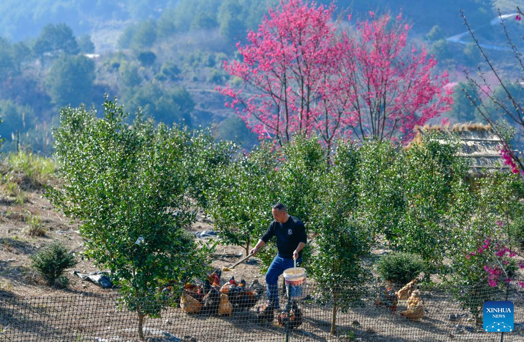 Wu Guangrong feeds chickens at the ecological park in Longli County, southwest China's Guizhou Province, March 11, 2025. Wu Guangrong, born in Fangxiang Township of Guizhou Province, has been engaged in the landscaping industry for many years since he graduated from a forestry vocational school in 2001.