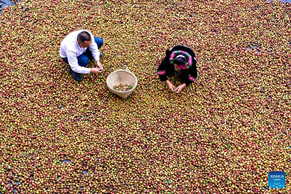 Wu Guangrong (L) and a villager dry oil tea camellia fruits at the ecological park in Longli County, southwest China's Guizhou Province, Oct. 15, 2024. Wu Guangrong, born in Fangxiang Township of Guizhou Province, has been engaged in the landscaping industry for many years since he graduated from a forestry vocational school in 2001.