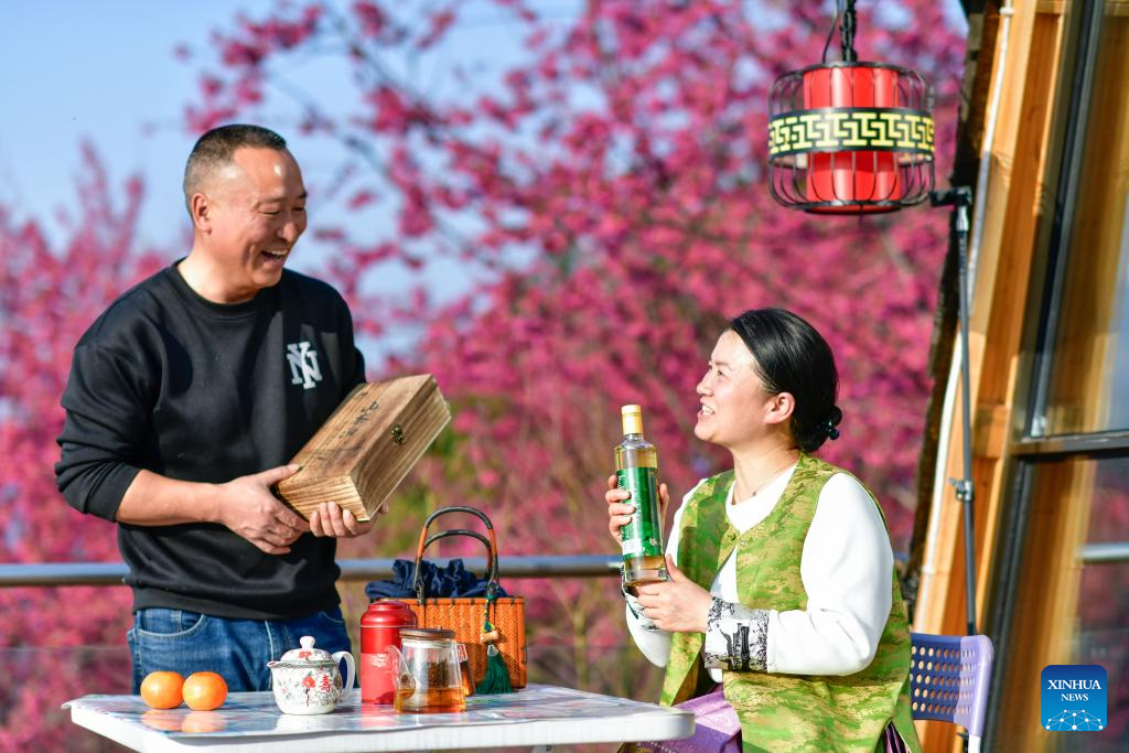 Wu Guangrong (L) introduces camellia oil to a visitor at the ecological park in Longli County, southwest China's Guizhou Province, March 11, 2025. Wu Guangrong, born in Fangxiang Township of Guizhou Province, has been engaged in the landscaping industry for many years since he graduated from a forestry vocational school in 2001.