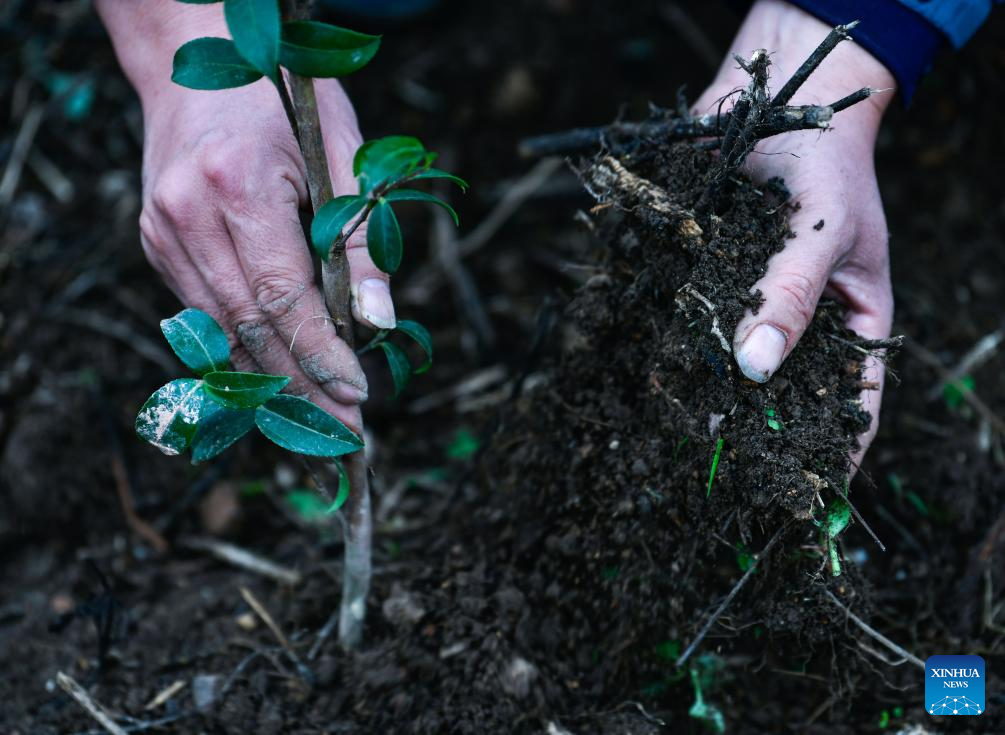 Wu Guangrong plants oil tea camellia trees at the ecological park in Longli County, southwest China's Guizhou Province, March 12, 2025. Wu Guangrong, born in Fangxiang Township of Guizhou Province, has been engaged in the landscaping industry for many years since he graduated from a forestry vocational school in 2001.