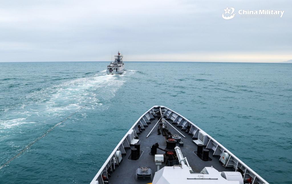 A frigate attached to a naval frigate flotilla under the Chinese PLA Southern Theater Command engages in an astern replenishment training during a multi-subject training exercise on February 12, 2025. (eng.chinamil.com.cn/Zhang Bin)
