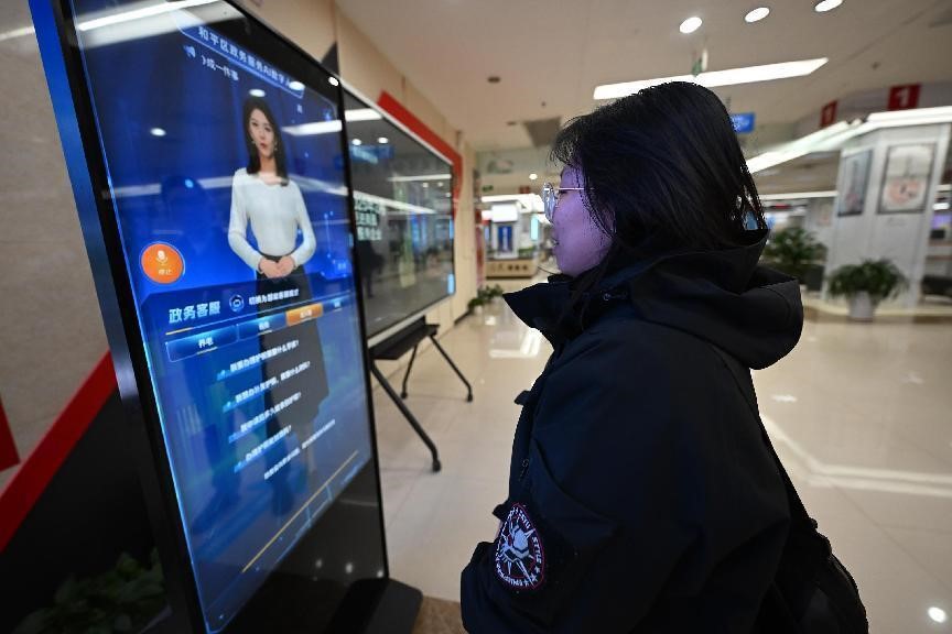At a government service center in Shenyang, northeast China's Liaoning province, a woman interacts with an AI-driven service terminal designed to streamline administrative processes. (People's Daily Online/Zhao Jingdong)