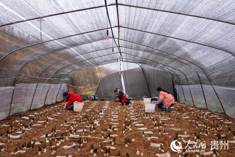Villagers harvest morel mushrooms at a morel mushroom base in Xingyi city, southwest China's Guizhou Province. (People's Daily Online/Tu Min)