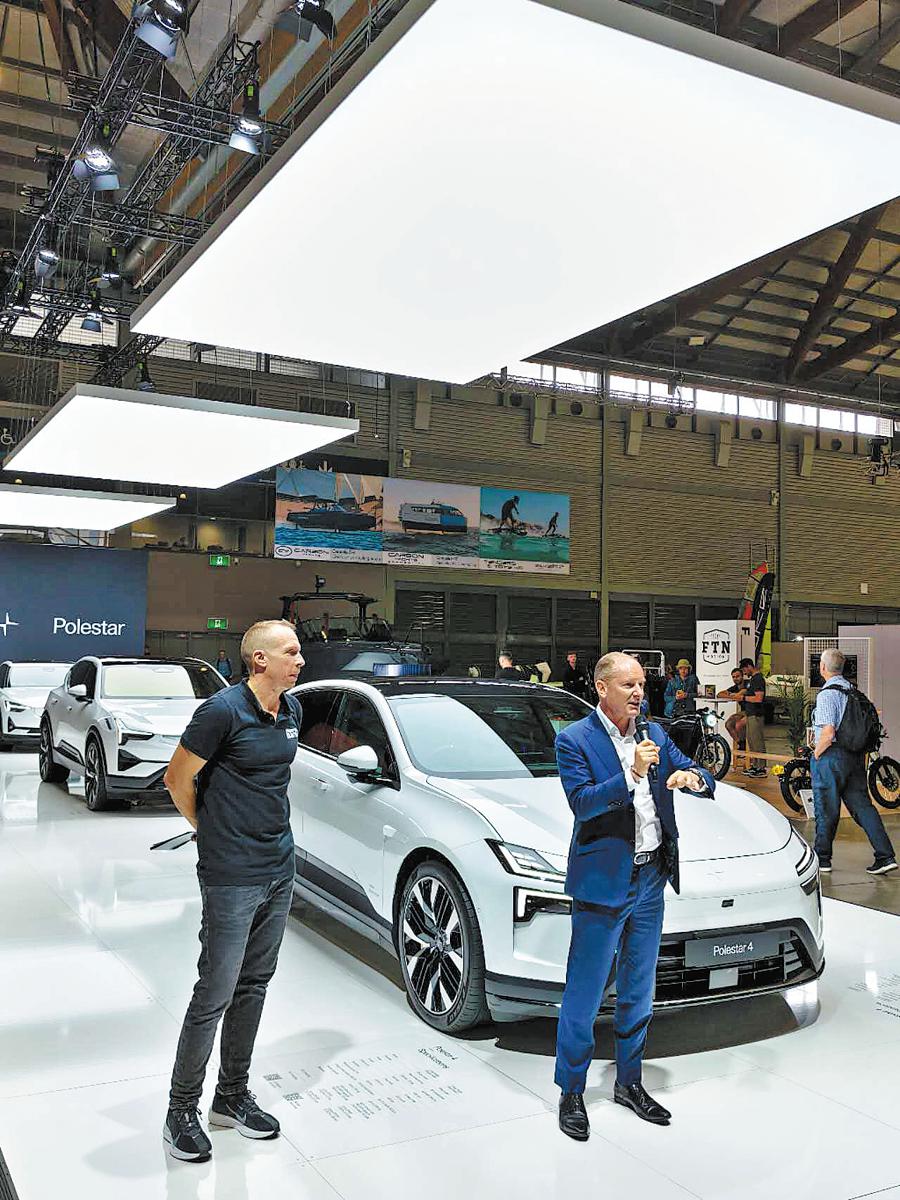 Dan Caesar (left), CEO of the Everything Electric show, and Scott Maynard, Polestar's managing director in Australia, introduce Polestar's electric vehicle models during the opening of the event on March 7. (Alexis Hooi/China Daily)