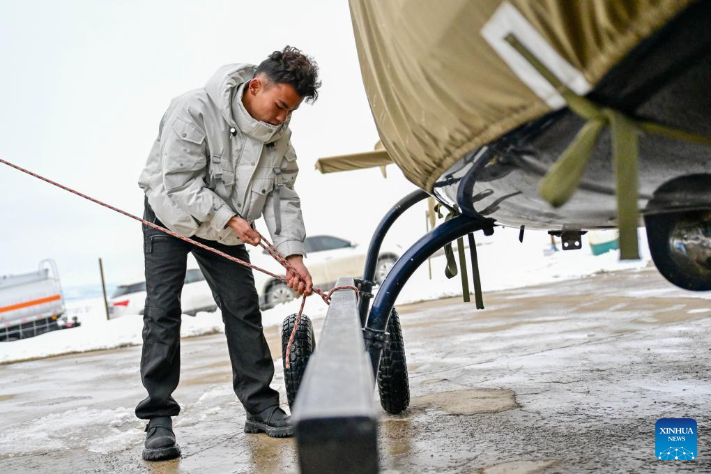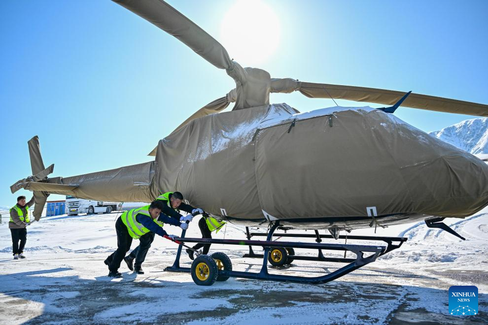Mirbek Tlobek maintains the helicopter at a general aviation company in Ili Kazak Autonomous Prefecture, northwest China's Xinjiang Uygur Autonomous Region, on March 4, 2025. (Xinhua/Ding Lei)