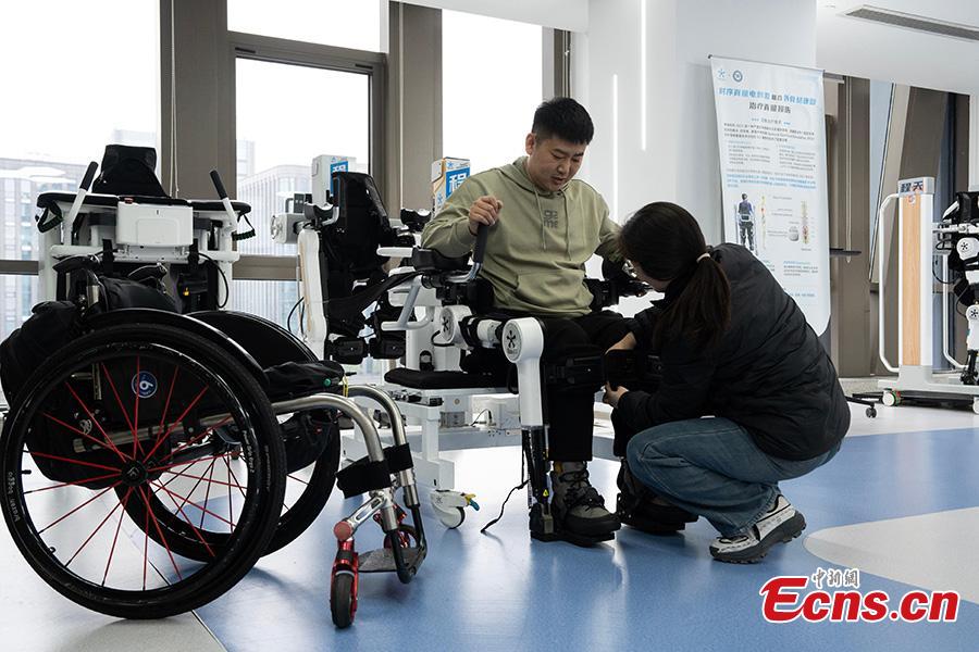 A technician helps a disabled man to fix robotic exoskeleton, in Hangzhou City, Zhejiang Province, March 13, 2025. (China News Service/Wu Junyi)