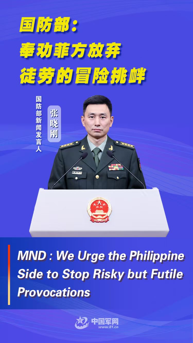 Zhang Xiaogang: China has indisputable sovereignty over Nanhai Zhudao and its adjacent waters, and has sovereign rights and jurisdiction over relevant waters. We are committed to peace and stability in the region. In fact, there has never been any problem with regard to the freedom of navigation and overflight in the South China Sea. However, the Philippine side has repeatedly infringed on China’s sovereignty and made provocative moves, and some countries outside the region keep fanning the flames and stirring up troubles. Their behaviors undermined tranquility in the South China Sea. With many options in our toolkit, China stands firm in our resolve to protect our territorial sovereignty and maritime rights and interests. We urge the Philippine side not to miscalculate the situation, to immediately stop risky but futile provocations, and to return to the right track of properly handling disputes through dialogue.
