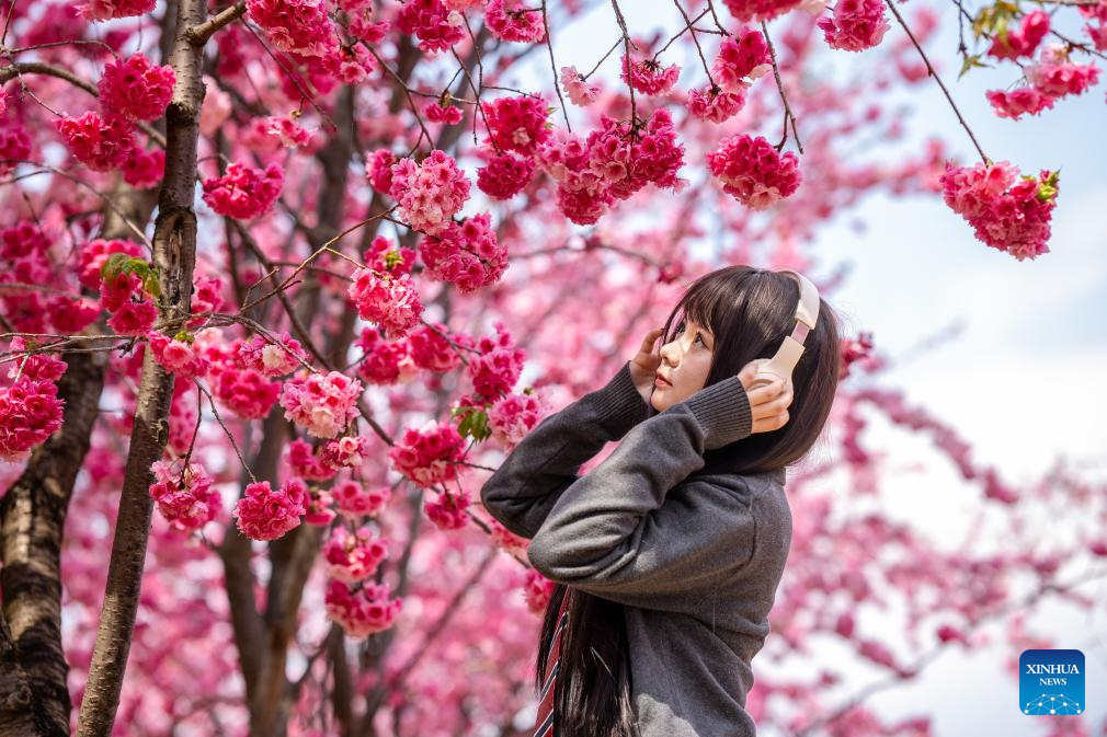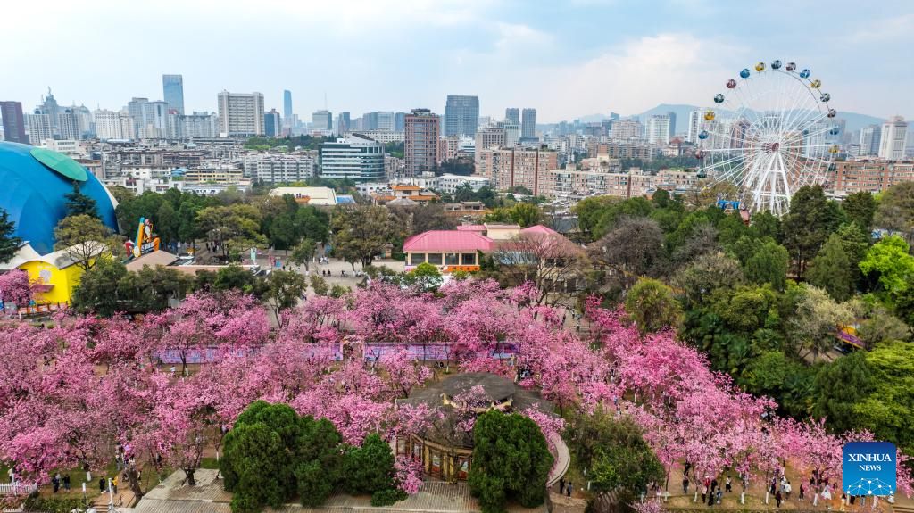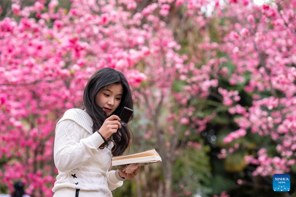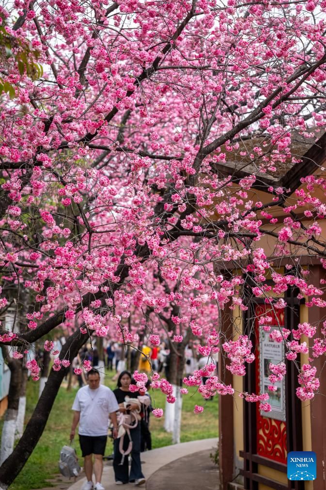 People enjoy cherry blossoms at Yuantongshan Park in Kunming, southwest China's Yunnan Province, March 14, 2025. (Xinhua/Hu Chao)