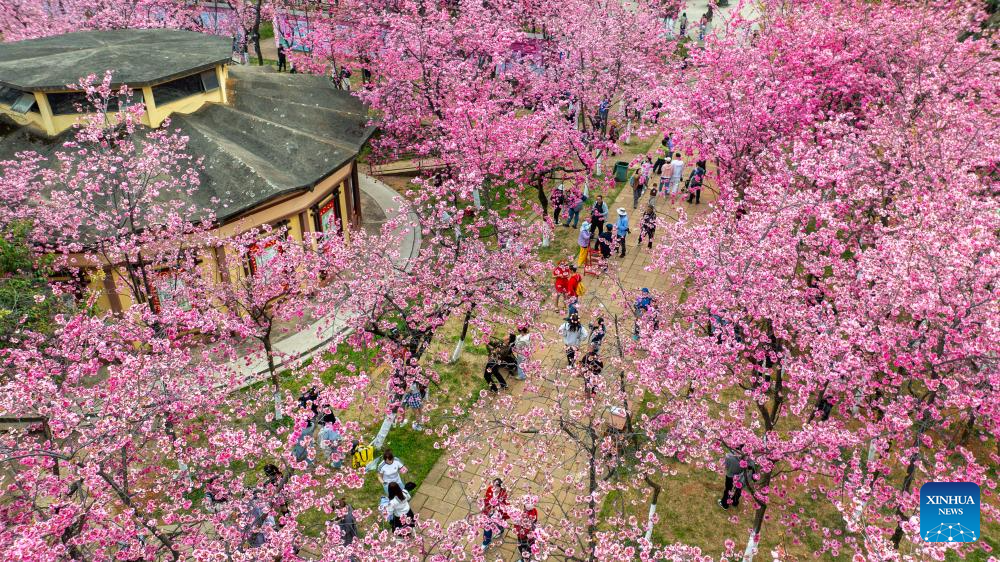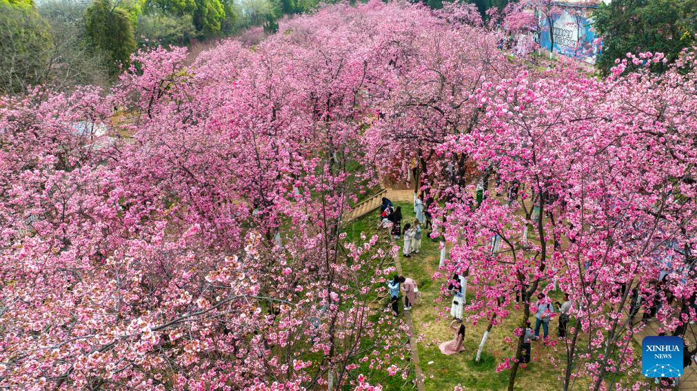An aerial drone photo taken on March 14, 2025 shows people enjoy cherry blossoms at Yuantongshan Park in Kunming, southwest China's Yunnan Province. (Xinhua/Hu Chao)