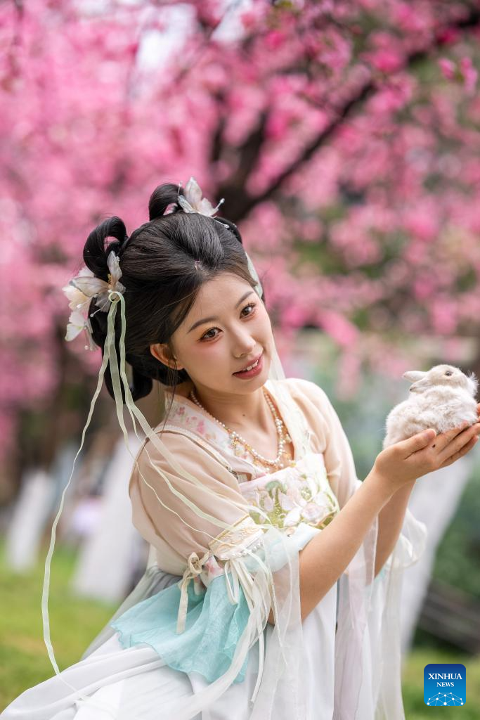 A woman poses for a photo under cherry blossoms at Yuantongshan Park in Kunming, southwest China's Yunnan Province, March 14, 2025. (Xinhua/Hu Chao)