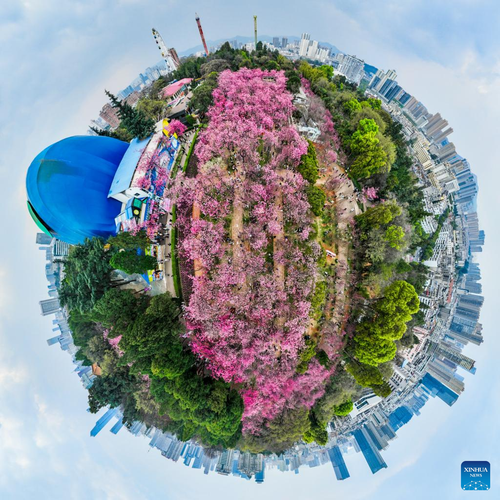 A panoramic drone photo taken on March 14, 2025 shows cherry blossoms at Yuantongshan Park in Kunming, southwest China's Yunnan Province. (Xinhua/Hu Chao)