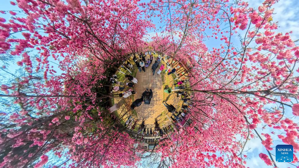 A panoramic photo taken on March 14, 2025 shows people enjoy cherry blossoms at Yuantongshan Park in Kunming, southwest China's Yunnan Province. (Xinhua/Hu Chao)