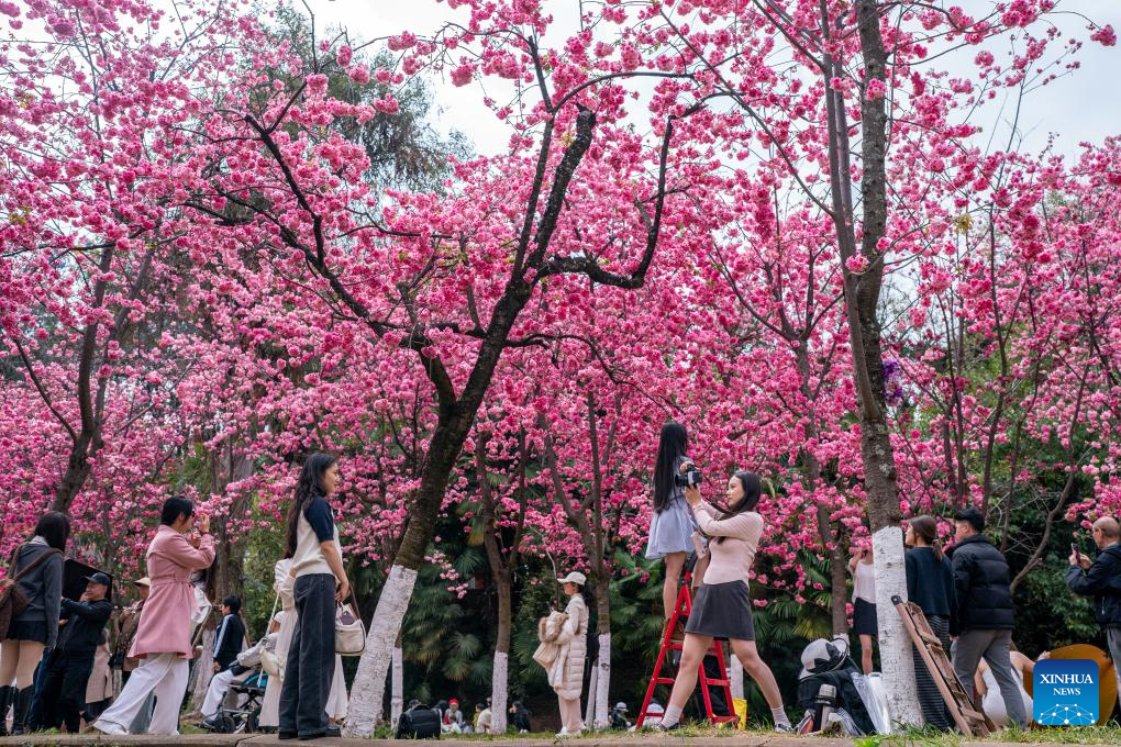 People take photos under cherry blossoms at Yuantongshan Park in Kunming, southwest China's Yunnan Province, March 14, 2025. (Xinhua/Hu Chao)