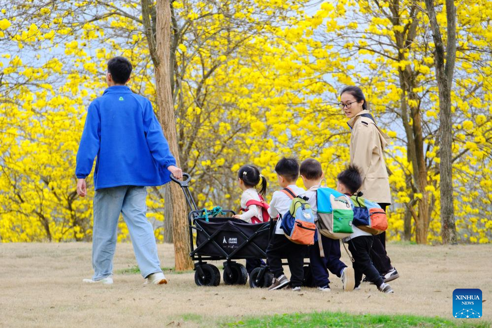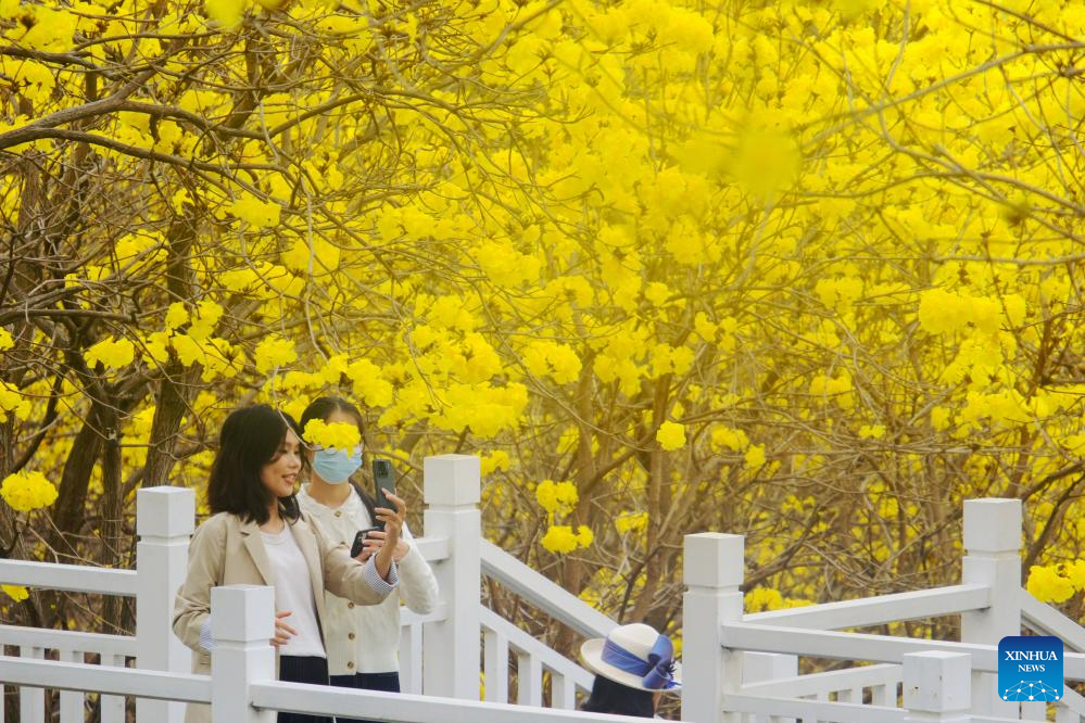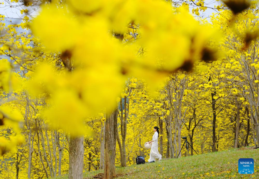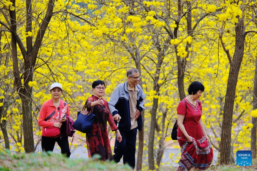 People enjoy tabebuia chrysantha blossoms at Qingxiu Mountain scenic area in Nanning, south China's Guangxi Zhuang Autonomous Region, on March 14, 2025. (Xinhua/Zhou Hua)