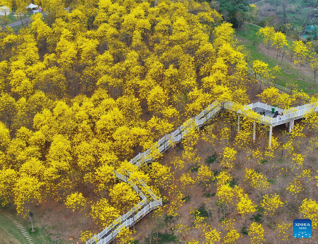 An aerial drone photo taken on March 14, 2025 shows tabebuia chrysantha blossoms at Qingxiu Mountain scenic area in Nanning, south China's Guangxi Zhuang Autonomous Region. (Xinhua/Zhou Hua)