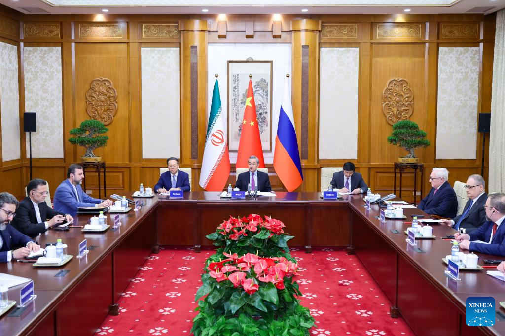 Chinese Foreign Minister Wang Yi, also a member of the Political Bureau of the Communist Party of China Central Committee, meets with Russian Deputy Foreign Minister Ryabkov Sergey Alexeevich and Iranian Deputy Foreign Minister Kazem Gharibabadi in Beijing, capital of China, March 14, 2025. China proposed five points on the proper settlement of the Iranian nuclear issue, as Wang met with Ryabkov Sergey Alexeevich and Kazem Gharibabadi in Beijing on Friday. (Xinhua/Liu Bin)