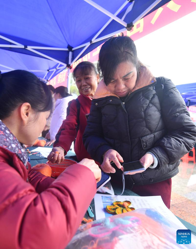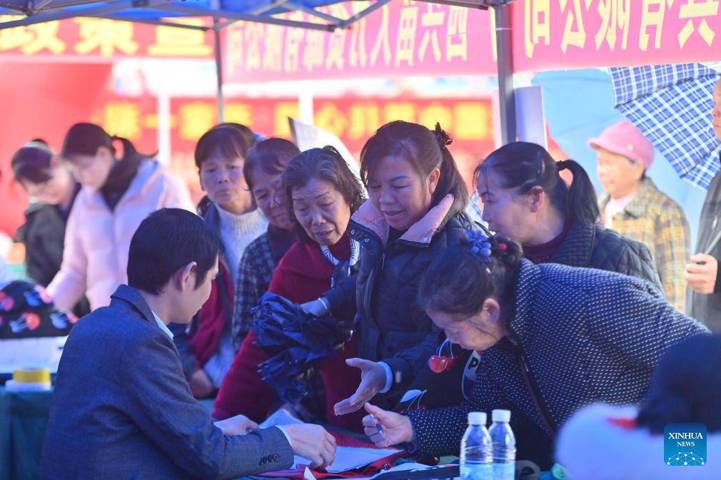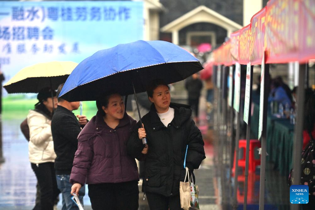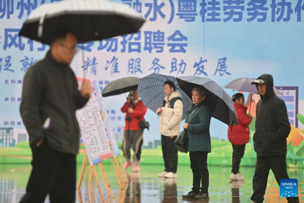 People learn about recruitment information at a job fair in Rongshui Miao Autonomous County of Liuzhou City, south China's Guangxi Zhuang Autonomous Region, March 14, 2025.