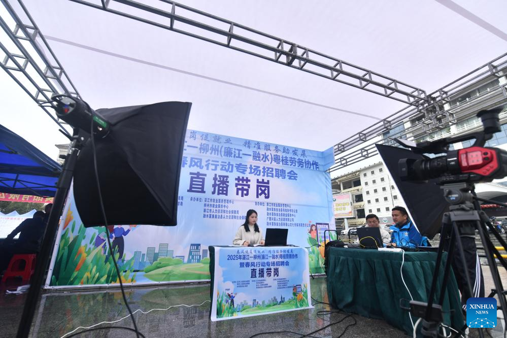 A staff member introduces job information via live-streaming at a job fair in Rongshui Miao Autonomous County of Liuzhou City, south China's Guangxi Zhuang Autonomous Region, March 14, 2025.
